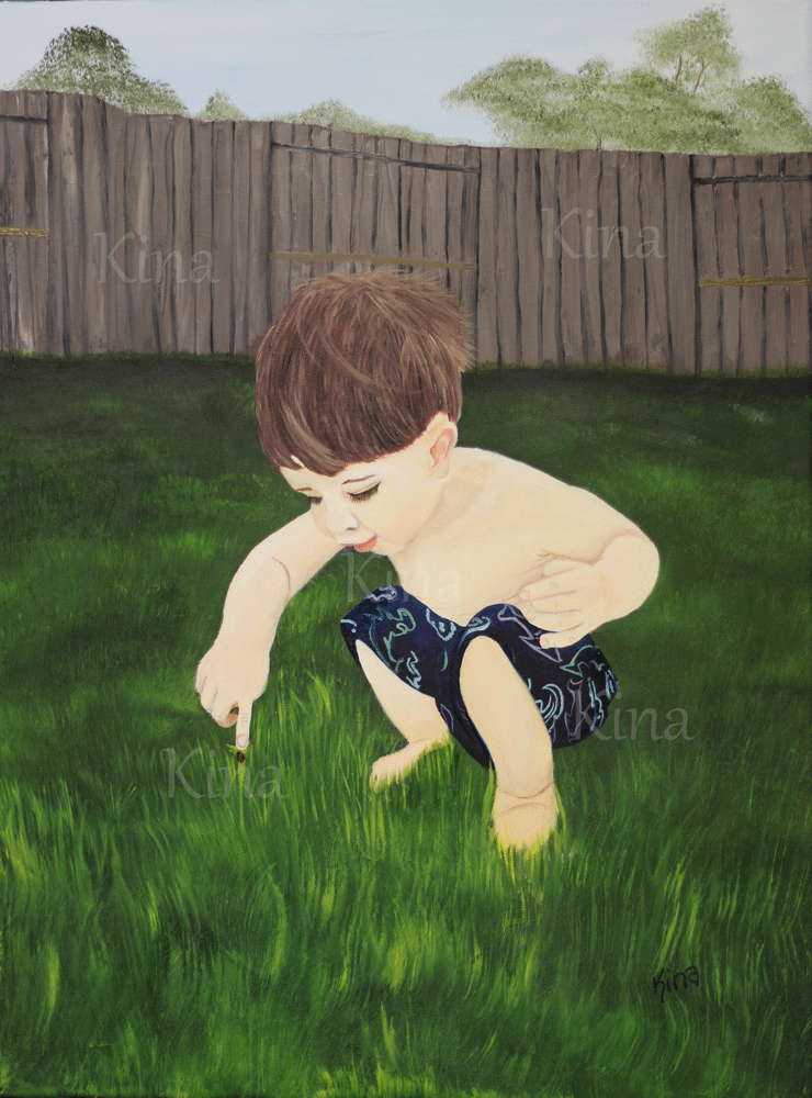 The print of a toddler pointing at a bug he found in the grass.
